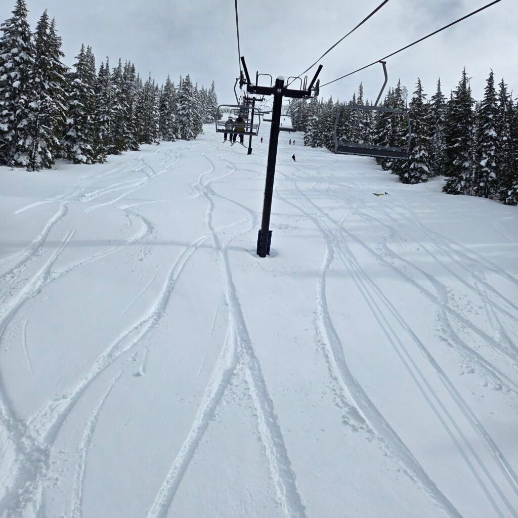 One of the largest resorts of North America, 12 lifts, 8 are high speed. ≈ 4300 acres of skiable terrain. 3,365 feet of vertical drop. Snow can be a little lower moisture content (drier) than on Mt Hood.